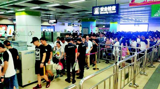 圖為:昨日18時23分,楚河漢街站內(nèi)站滿了等待安檢的市民