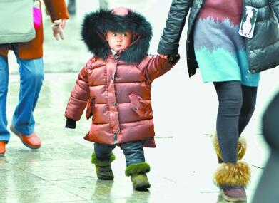 21日,中山公園地鐵車(chē)站外,一名穿著厚厚冬裝的小男孩牽著媽媽的手準(zhǔn)備進(jìn)站乘車(chē)