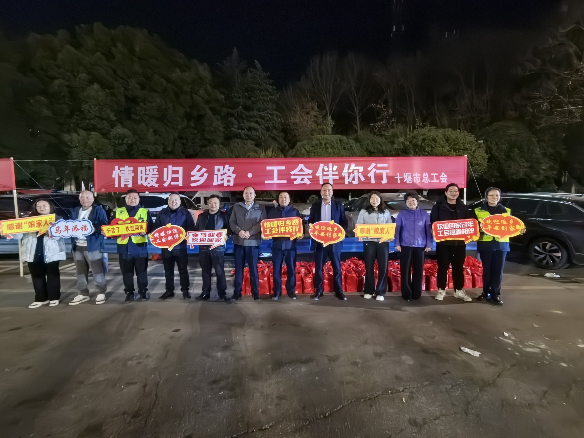 盡管夜色已深、寒意正濃,十堰市總工會(huì)的工作人員早已守候在此,第一時(shí)間為風(fēng)塵仆仆的工友們遞上熱騰騰的豆奶、雞蛋和面包,并送上一份份飽含心意的“暖心禮包”。