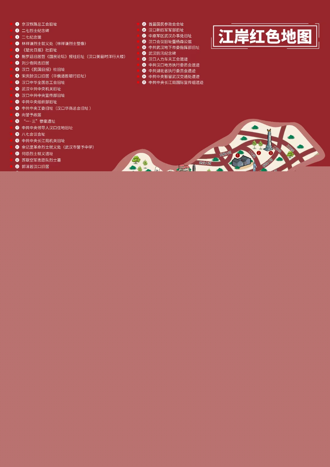 歷史是最好的教科書。該區(qū)將轄區(qū)內(nèi)35處紅色點位進行梳理,經(jīng)實地走訪、查閱史料、專家論證,繪制出《江岸紅色地圖》。這份地圖包含重要革命遺址遺跡、舊址及紀念設(shè)施,涵蓋了國家級、省級、市級文物保護單位。
