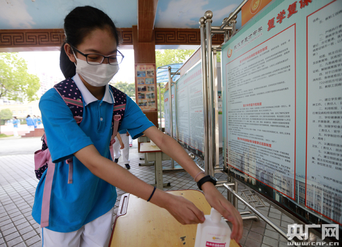 圖為:2020年8月28日,在湖北省武漢市楚才中學(xué),一名七年級學(xué)生正在進(jìn)行入教室前的消毒。(央廣網(wǎng)發(fā) 通訊員王方攝)