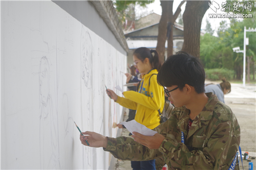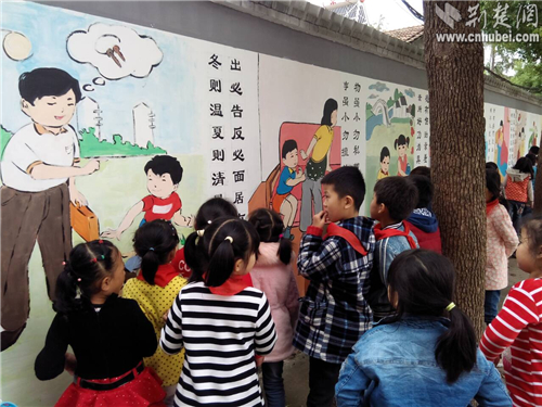 上周日,武漢輕工大學藝術與傳媒學院晨曦志愿服務團隊的56名同學來到先進小學,為學校的兩面墻上繪上《弟子規(guī)》主題水粉畫。經(jīng)過一天的努力,44幅主題畫、1002個字將整部《弟子規(guī)》在墻上呈現(xiàn)出來。