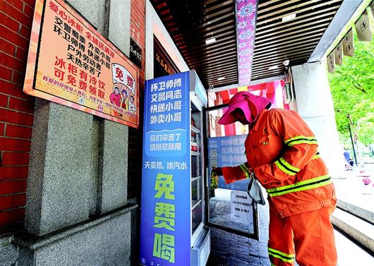 圖為:一名環(huán)衛(wèi)工在愛心冰柜中取飲品。 (湖北日報(bào)全媒記者 張朋 實(shí)習(xí)生 王梓涵 攝)