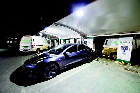 圖為:8月28日晚,一輛特斯拉電動車在武漢徐東大街的一家充電站充電。該車充滿約60度電,電費不足70元,可行駛近500公里。