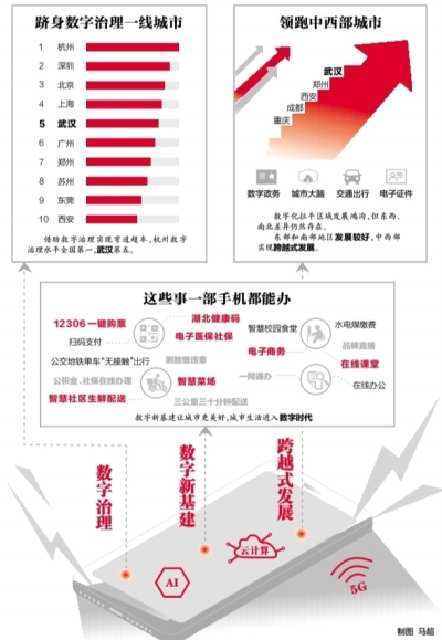 報告顯示,武漢、鄭州、西安等中西部城市實(shí)現(xiàn)跨越式發(fā)展,成為數(shù)字治理一線城市。其中,武漢領(lǐng)跑中西部城市,率先受益數(shù)字化,實(shí)現(xiàn)城市跨越式發(fā)展。