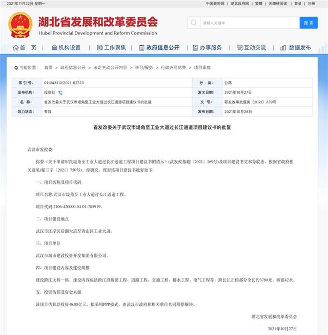 據(jù)介紹,該項(xiàng)目將建設(shè)跨江大橋一座,建設(shè)內(nèi)容包括跨江段橋梁工程、道路工程、交通工程、排水工程、電氣工程等,跨長江正橋部分全長約3780米,橋?qū)?2米。項(xiàng)目單位為武漢市城市建設(shè)投資開發(fā)集團(tuán)有限公司,項(xiàng)目估算總投資46.88億元,擬采用PPP模式,由武漢市政府和相關(guān)單位共同籌資。