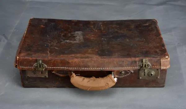 皮箱為棕褐色,長45厘米、寬26厘米、高11.5厘米,呈長方形,牛皮質(zhì)地。經(jīng)過近百年的風(fēng)雨洗禮,它已斑駁破舊。