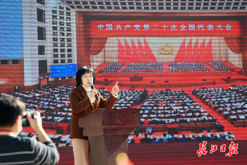 音樂(lè)展示《國(guó)際歌》《春天的故事》《理想》、聽(tīng)歌識(shí)曲《東方紅》《游擊隊(duì)歌》《紅梅贊》、湖北大鼓《二十大精神指航向》、全場(chǎng)合唱《沒(méi)有共產(chǎn)黨就沒(méi)有新中國(guó)》……課程圍繞黨的二十大主題、大會(huì)報(bào)告的主要內(nèi)容和核心要義進(jìn)行了系統(tǒng)闡述,同時(shí)音樂(lè)與黨課互相交融,現(xiàn)場(chǎng)觀眾在紅色經(jīng)典曲目中感受一幕幕或悲壯激烈,或輝煌壯麗的黨史畫(huà)卷。
