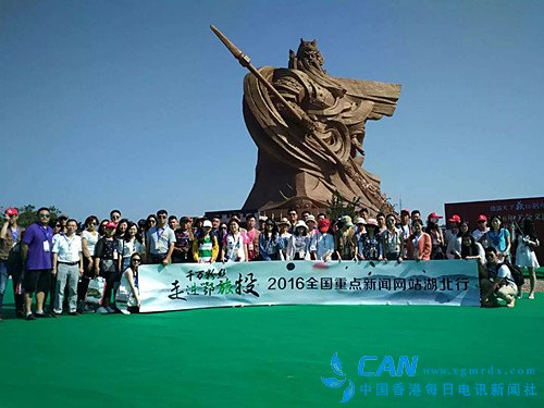 2016年千萬粉絲走進(jìn)鄂旅投的媒體記者在關(guān)公銅像前合影留念