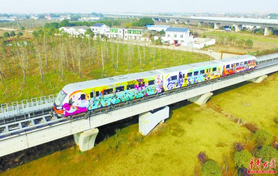 12月15日上午,畫滿涂鴉的磁浮專列從長沙榔梨站經(jīng)過。當天,該專列完成“變裝”,從湖南磁浮公司綜合檢修庫駛出,與廣大市民朋友見面。列車兩面的作品由來自國內(nèi)外的20位涂鴉大師聯(lián)手創(chuàng)作,3節(jié)車廂共繪有6幅涂鴉作品,創(chuàng)作者通過構圖彼此獨立、主題相互呼應的彩色涂鴉,突出城市幸福感和軌道交通的綠色發(fā)展理念。