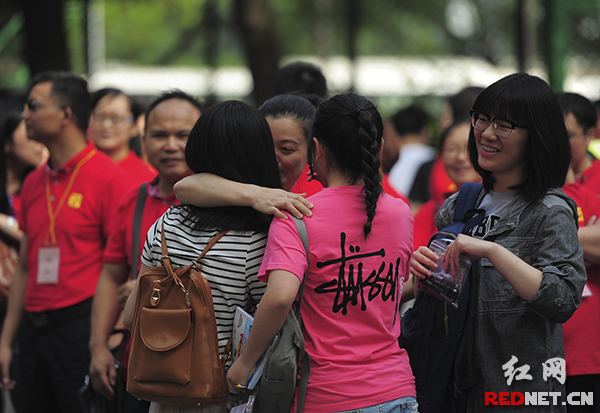 家長在考試前擁抱考生。