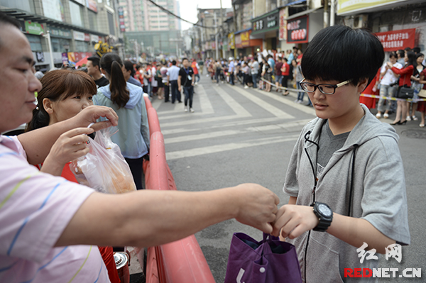 考生接過家長準備的午餐。