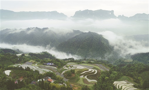 云上田園美如畫,5月10日,張家界市永定區(qū)大坪鎮(zhèn)堡子界雨后初霽,山間彌漫的云霧與層疊交錯(cuò)的梯田,勾勒出美如畫卷的“云上田園”。吳勇兵 攝