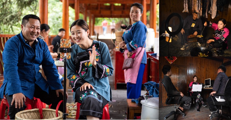 拼版照片:左圖為十八洞村扶貧隊(duì)長(zhǎng)麻輝煌(左)與返鄉(xiāng)大學(xué)生施林嬌(中)在湖南湘西十八洞村,一起直播推銷土特產(chǎn)(5月15日攝);右上為施林嬌(右)在直播中向觀眾展示炒好的臘肉(4月23日攝);右下為施林嬌(中)在工作室內(nèi)和施康(左)、施志春(右)一起商討直播內(nèi)容(4月23日攝)。