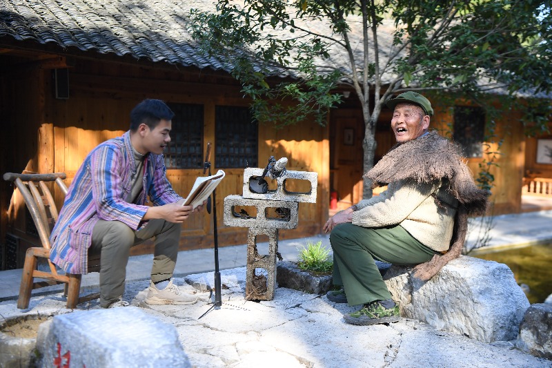 11月15日,彭國(guó)飛(右)和團(tuán)隊(duì)伙伴彭超文在湖南湘西芙蓉鎮(zhèn)錄制短視頻。2020年初,75歲的彭國(guó)飛參加村里辦的鄉(xiāng)村“網(wǎng)紅”培訓(xùn)班,并獲贈(zèng)一臺(tái)智能手機(jī),遂開始了他的“網(wǎng)紅”生涯。飛爺爺和幾名“90后”組成團(tuán)隊(duì),一起策劃、錄制短視頻,直播銷售農(nóng)產(chǎn)品。由于風(fēng)格突出、內(nèi)容有趣,作品在短視頻平臺(tái)獲得眾多網(wǎng)友點(diǎn)贊。