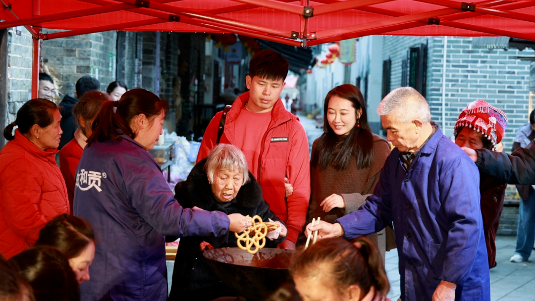 村民與游客歡聚一堂,一同抖糍粑、炸套花,在傳統(tǒng)年俗中回望“記憶里的春節(jié)”。民俗廣場(chǎng)上,木槌起落間糯米翻滾,大家你一棒、我一棒默契配合,熱氣氤氳、香氣撲鼻,剛打好的糍粑軟糯香甜,孩子們捧在手中,笑容格外燦爛。一旁的炸套花現(xiàn)場(chǎng)同樣熱鬧,熱鍋中的油滋滋作響,香氣漫溢古巷。