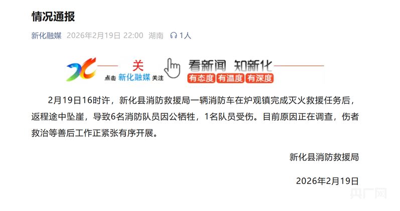 央廣網(wǎng)婁底2月19日消息(記者 黃珂嵐)2月19日,記者從湖南省婁底市新化縣消防救援局獲悉,當日16時許,新化縣消防救援局一輛消防車在當?shù)貭t觀鎮(zhèn)完成滅火救援任務后,返程途中意外墜崖,導致6名消防隊員因公犧牲,1名消防隊員受傷。目前事故原因調查、傷者救治等善后工作正在進行。