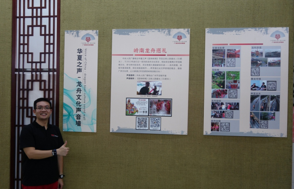 中央人民廣播電臺廣州節(jié)目制作室《韻味嶺南》節(jié)目主持人陳健光(播音名:DJ肥光)于2013年曾經(jīng)制作過系列報道《賽龍奪錦——嶺南龍舟巡禮》,期間曾探訪過珠三角各地的龍舟文化,例如:廣州天河珠村起龍舟、廣州番禺沙亭龍船乸文化、廣州下滘龍舟廠龍舟制作技藝、廣州大塘村龍船鼓制作、佛山南海專業(yè)龍舟隊建設(shè)、番禺沙滘中學(xué)龍舟文化節(jié)、香港大澳龍舟游涌……而廣州第六屆廣府文化節(jié)設(shè)立了廣府龍舟文化的展館,《韻味嶺南》節(jié)目的龍舟文化系列報道正契合此次展覽,于是收到廣州市人民政府文史研究館的邀請,雙方運用新媒體技術(shù),在展館現(xiàn)場設(shè)立了一幅“龍舟聲音墻”,上面配有相關(guān)節(jié)目的二維碼,觀眾用手機掃描后即可在線收聽龍舟文化節(jié)目。