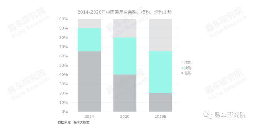 近六年中國(guó)車市的換購(gòu)占比持續(xù)提升,由2014年25%升至2020年40%,與首購(gòu)旗鼓相當(dāng)。2021-2026年,一方面近十年積累的首購(gòu)消費(fèi)者,會(huì)加速涌入換購(gòu)車市,另一方面青年人數(shù)持續(xù)減少與加速涌入二手車市場(chǎng)等,會(huì)持續(xù)壓縮首購(gòu)新車市場(chǎng),兩者直接或間接共同助力換購(gòu)車市。預(yù)判2021年起換購(gòu)將成為中國(guó)第一車市,2026年換購(gòu)占比有望升至45%;