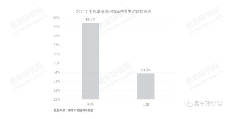 2021上半年,單身消費(fèi)者主動(dòng)貸款購(gòu)車的意愿明顯強(qiáng)于已婚群體,前者高達(dá)59.4%,后者53.9%;