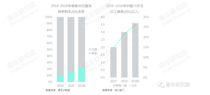 2021-2026年,隨著晚婚晚育、離婚等“持續(xù)泛濫”,預(yù)判2026年中國(guó)社會(huì)的單身人口占比將超過(guò)25%,中國(guó)車市的單身銷量占比將升至23%;