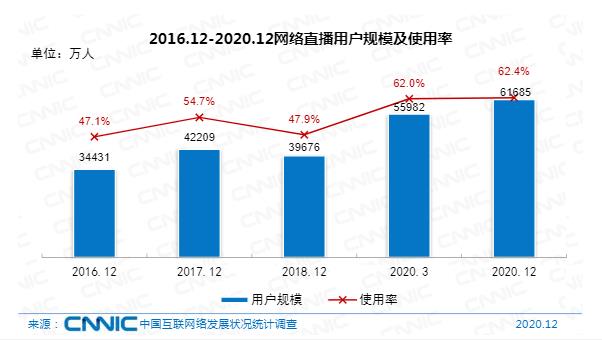 截至2020年12月,我國網(wǎng)絡(luò)直播用戶規(guī)模達(dá)6.17億,較2020年3月增長5703萬,占網(wǎng)民整體的62.4%。其中,電商直播用戶規(guī)模為3.88億,較2020年3月增長1.23億,占網(wǎng)民整體的39.2%。此外,真人秀直播和演唱會直播用戶數(shù)較2020年3月均有所增長,占比分別為24.2%和19.2%;游戲直播和體育直播用戶數(shù)較2020年3月均減少,占比分別為19.3%和13.9%。