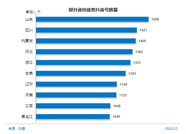 河南省各級政府共開通政務(wù)機(jī)構(gòu)微博10130個(gè),居全國首位。開通政務(wù)頭條號最多的省份為山東省,共開通7874個(gè);共10個(gè)省份開通的政務(wù)頭條號超過3000個(gè)。同時(shí),山東也是開通政務(wù)抖音號數(shù)量最多的省份,共開通1586個(gè)。