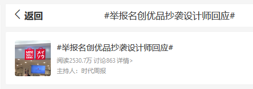 隨后,名創(chuàng)優(yōu)品被設(shè)計(jì)師舉報(bào)抄襲的消息迅速發(fā)酵,相關(guān)話(huà)題登上微博熱榜單。兩天內(nèi),#名創(chuàng)優(yōu)品被設(shè)計(jì)師舉報(bào)抄襲#的話(huà)題閱讀量超2.3億。當(dāng)日下午,名創(chuàng)優(yōu)品客服表示,已經(jīng)報(bào)備相關(guān)部門(mén)進(jìn)行核查。