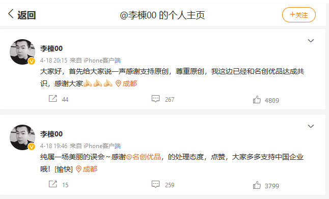 然而,很快,“戲劇化”的一幕出現(xiàn)了。18日晚間,設(shè)計(jì)師@李棟00 改口了。該名設(shè)計(jì)師連發(fā)兩條微博回應(yīng)稱(chēng),“純屬一場(chǎng)美麗的誤會(huì)”,還為名創(chuàng)優(yōu)品點(diǎn)贊,表示已和名創(chuàng)優(yōu)品達(dá)成共識(shí),并在接受媒體采訪(fǎng)時(shí)表示,將與名創(chuàng)優(yōu)品合作1-3年。