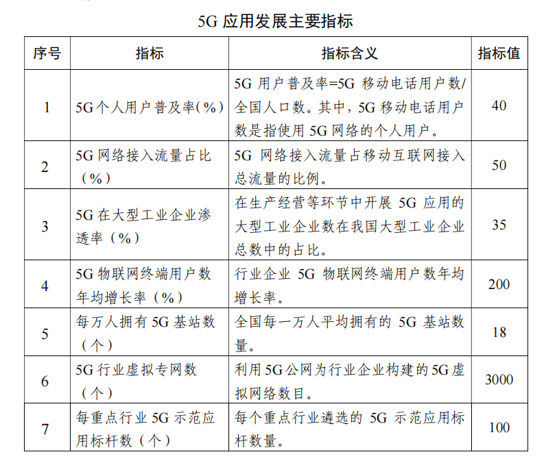 二是重點(diǎn)領(lǐng)域5G應(yīng)用成效凸顯。個(gè)人消費(fèi)領(lǐng)域,打造一批“5G+”新型消費(fèi)的新業(yè)務(wù)、新模式、新業(yè)態(tài),用戶“獲得感”顯著提升。垂直行業(yè)領(lǐng)域,大型工業(yè)企業(yè)的5G應(yīng)用滲透率超過(guò)35%,電力、采礦等領(lǐng)域5G應(yīng)用實(shí)現(xiàn)規(guī)模化復(fù)制推廣,5G+車聯(lián)網(wǎng)試點(diǎn)范圍進(jìn)一步擴(kuò)大,提升農(nóng)業(yè)水利等傳統(tǒng)行業(yè)數(shù)字化轉(zhuǎn)型升級(jí)。社會(huì)民生領(lǐng)域,打造一批5G+智慧教育、5G+智慧醫(yī)療的樣板項(xiàng)目,利用5G智慧城市等管理水平。每個(gè)重點(diǎn)行業(yè)打造100個(gè)以上的5G示范應(yīng)用標(biāo)桿。