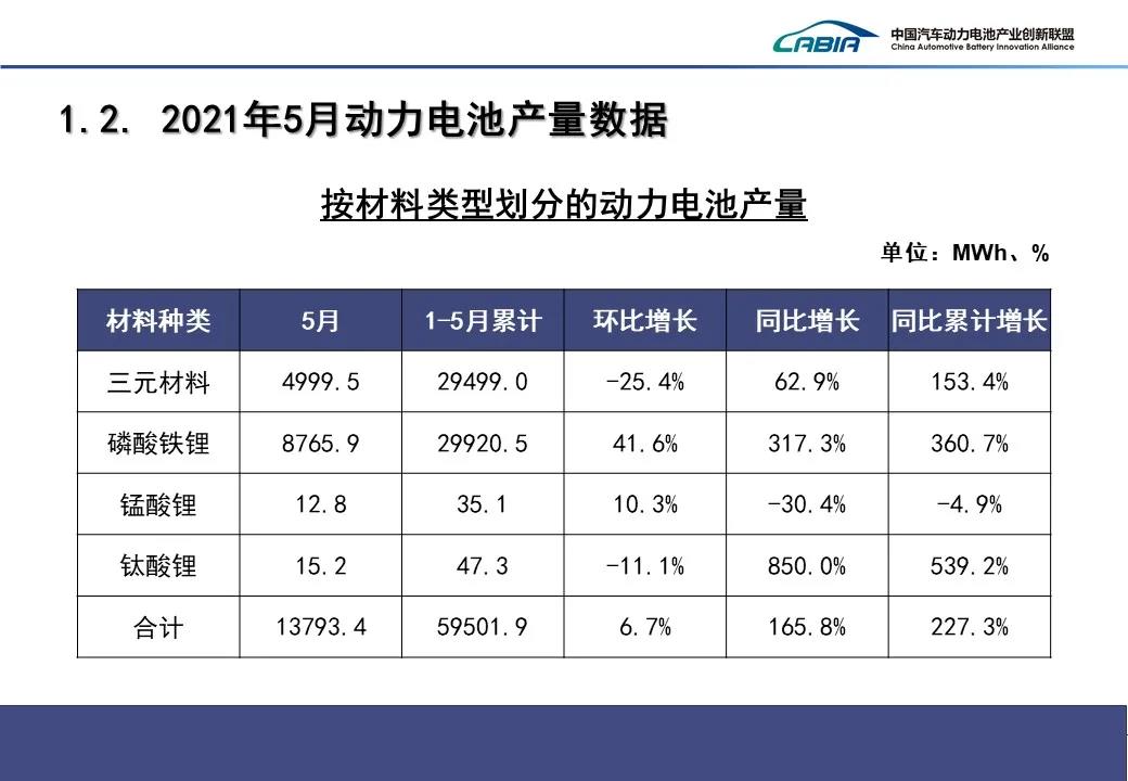 1-5月,我國動力電池產量累計59.5GWh,同比累計增長227.3%。其中三元電池產量累計29.5GWh,占總產量49.6%,同比累計增長153.4%;磷酸鐵鋰電池產量累計29.9GWh,占總產量50.3%,同比累計增長360.7%。