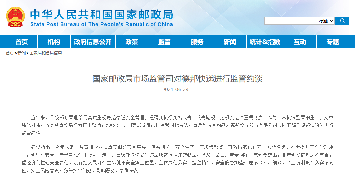 央廣網(wǎng)北京6月23日消息(記者 牛谷月)記者從國家郵政局官方獲悉,6月22日,國家郵政局市場監(jiān)管司就違法收寄危險違禁物品對德邦物流股份有限公司(以下簡稱德邦快遞)進(jìn)行監(jiān)管約談。