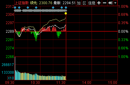 新華網(wǎng)消息 4日滬深兩市早盤雙雙微幅高開,隨后出現(xiàn)了調(diào)整,盤中兩市再創(chuàng)新高,滬指迫近2300點整數(shù)關(guān)口。截至午盤,滬指報2294.51點,上漲5.88點,漲幅0.26%,成交926.8億元;深成指報8143.14點,上漲27.28點,漲幅0.34%,成交1183億元;創(chuàng)業(yè)板指報1486.39點,上漲8.72點,漲幅0.59%,成交251.2億元。