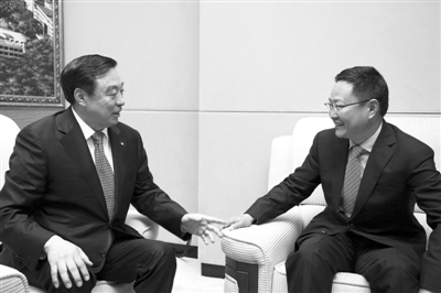 昨日,田惠宇(右)正式當(dāng)選招行行長(zhǎng)。近日,“前任行長(zhǎng)”馬蔚華(左)與“接班人”田惠宇在一起“愉快交談”。 資料圖:招行提供