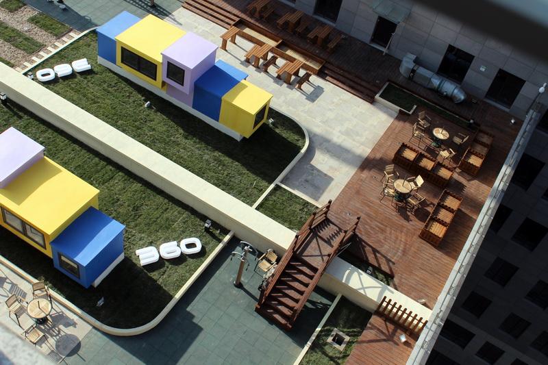 小艾:是這樣子的,因為大家雖然可以去底下,但是樓上的一些員工可能坐電梯不是很方便,下樓梯也可能不是很方便,所以說公司在中央一層建了這么一個區(qū)域,然后大家可以呼吸呼吸新鮮空氣。
