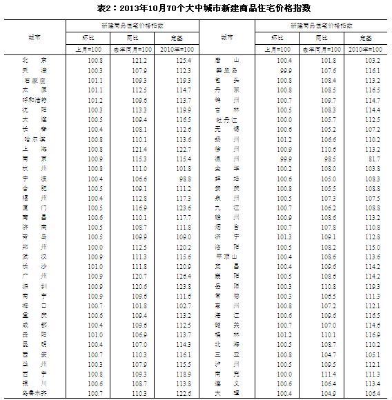 統(tǒng)計(jì)局發(fā)布了10月份70個(gè)大中城市住宅銷售價(jià)格變動(dòng)情況。其中,新建商品住宅(不含保障性住房)價(jià)格與上月相比,70個(gè)大中城市中,價(jià)格下降的城市有2個(gè),持平的城市有3個(gè),上漲的城市有65個(gè)。環(huán)比價(jià)格變動(dòng)中,最高漲幅為1.3%,最低為下降0.1%。