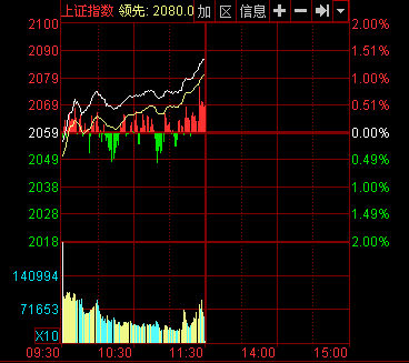 新華網(wǎng)消息 今日早盤兩市低開后震蕩走高,軍工股表現(xiàn)活躍,煤炭、銀行、券商等權(quán)重板塊集體拉升。蹺蹺板效應(yīng)再現(xiàn),創(chuàng)業(yè)板一度跌近1%。截至午盤,滬指報(bào)2086.39點(diǎn),上漲27.55點(diǎn),漲幅1.34%,成交506.27億元;深成指報(bào)7465.99點(diǎn),上漲98.19點(diǎn),漲幅1.33%,成交512.19億元;創(chuàng)業(yè)板指報(bào)1344.21點(diǎn),下跌2.52點(diǎn),跌幅0.19%,成交110.20億元。