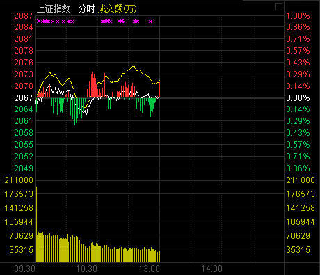 新華網(wǎng)消息 今日兩市開盤漲跌互現(xiàn),在熱門題材的拉動下,深成指數(shù)早盤小幅上揚,滬指表現(xiàn)稍顯弱勢在2070點處受阻,創(chuàng)業(yè)板指更是在小幅低開后早盤一路下挫。截至午盤,滬指報2067.27點,上漲0.62點,漲幅0.03%,成交590.3億元;深成指報7308.60點,上漲29.74點,漲幅0.41%,成交868.8億元;創(chuàng)業(yè)板指報1345.04點,下跌22.03點,跌幅1.61%,成交198.7億元。