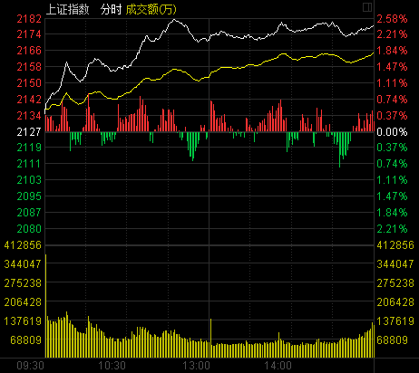 新華網(wǎng)消息 今日兩市雙雙跳空高開,早盤在金融股走強(qiáng)的帶動(dòng)下指數(shù)持續(xù)飆升,盤中滬指拉至2181.50點(diǎn),創(chuàng)出年內(nèi)新高。午后兩市漲幅雖有所收窄但依舊升勢不改穩(wěn)步上行,滬市成交量半日便過千億,收盤時(shí)亦刷新自去年9月以來的成交量最高值。截至收盤,滬指報(bào)2177.95點(diǎn),上漲51.34點(diǎn),漲幅2.41%,成交1804.14億元;深成指報(bào)7808.66點(diǎn),上漲230.54點(diǎn),漲幅3.04%,成交1533.79億元;創(chuàng)業(yè)板指報(bào)1314.53點(diǎn),上漲28.76點(diǎn),漲幅2.24%,成交224.29億元。