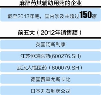 截至2013年底,國內(nèi)涉及麻醉藥及其輔助用藥的企業(yè)共超過150家。以2012年銷售額為例,前五大企業(yè)分別為英國第二大藥企阿斯利康、江蘇恒瑞醫(yī)藥(600276.SH)、武漢人福醫(yī)藥(600079.SH)、德國企業(yè)費森尤斯卡比以及日本丸石制藥公司。