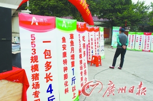 隨著生豬產(chǎn)業(yè)的發(fā)展,獸藥行業(yè)得到了更加迅速的發(fā)展。在四會養(yǎng)豬行業(yè)協(xié)會的年會上,眾多飼料企業(yè)打起了擂臺。記者看到一家獸藥企業(yè)打著大大的宣傳標語,“一包多長四斤”、“吃得多、拉得少”。