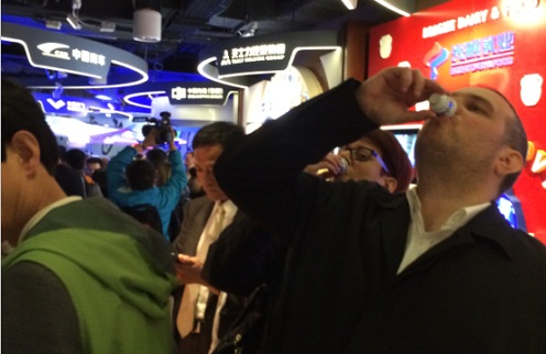 此次五糧液展區(qū)以明清風(fēng)格的展柜展臺營造出中式傳統(tǒng)文化的濃郁氛圍,向觀眾全面展示中國悠久的酒文化傳統(tǒng),以及五糧液的釀造歷史和未來發(fā)展。最值得一提的是,此次五糧液展區(qū)首次采用多媒體人機(jī)互動方式。當(dāng)游客靠近時,大屏幕就會出現(xiàn)兩位中國先生,并主動邀請游客入座,并講解中國白酒的歷史、釀造過程,以及介紹如何使用中式酒具、飲酒禮儀,同時還邀請游客與其隔空舉杯互相敬酒。