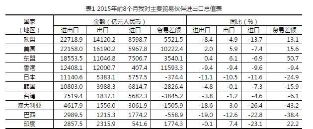 二、對(duì)美國(guó)、東盟出口保持增長(zhǎng),對(duì)歐盟、日本出口下降。前8個(gè)月,歐盟為我國(guó)第一大貿(mào)易伙伴,中歐貿(mào)易總值2.27萬(wàn)億元,下降8.4%,占我外貿(mào)總值的14.5%。其中,我對(duì)歐盟出口1.41萬(wàn)億元,下降4.9%;自歐盟進(jìn)口8598.7億元,下降13.7%;對(duì)歐貿(mào)易順差5521.5億元,擴(kuò)大13.1%。美國(guó)為我國(guó)第二大貿(mào)易伙伴,中美貿(mào)易總值為2.22萬(wàn)億元,增長(zhǎng)2%,占我外貿(mào)總值的14.1%。其中,我對(duì)美國(guó)出口1.62萬(wàn)億元,增長(zhǎng)5.9%;自美國(guó)進(jìn)口5967.8億元,下降7.4%;對(duì)美貿(mào)易順差1.02萬(wàn)億元,擴(kuò)大15.6%。