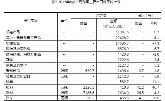 五、機(jī)電產(chǎn)品出口增長(zhǎng),傳統(tǒng)勞動(dòng)密集型產(chǎn)品有所下降。前8個(gè)月,我國(guó)機(jī)電產(chǎn)品出口5.11萬(wàn)億元,增長(zhǎng)0.7%,占出口總值的57%。其中,電器及電子產(chǎn)品出口2.24萬(wàn)億元,增長(zhǎng)4.1%;機(jī)械設(shè)備1.47萬(wàn)億元,下降7.3%。同期,服裝出口6876.9億元,下降6.7%;紡織品4420.8億元,下降1.8%;鞋類2222.6億元,下降3.4%;家具2127.2億元,增長(zhǎng)5.1%;塑料制品1496.4億元,增長(zhǎng)1.8%;箱包1142億元,增長(zhǎng)5.9%;玩具582.7億元,增長(zhǎng)11.1%;上述7大類勞動(dòng)密集型產(chǎn)品合計(jì)出口1.89萬(wàn)億元,下降2.1%,占出口總值的21.1%。此外,肥料出口2226.1萬(wàn)噸,增加41.2%;鋼材7186.6萬(wàn)噸,增加26.5%;汽車50.2萬(wàn)輛,減少14.1%(表2)。