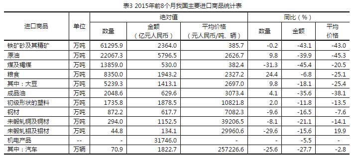 六、原油、糧食、成品油等主要大宗商品進(jìn)口量增加,主要進(jìn)口商品價(jià)格普遍下跌。前8個(gè)月,我國(guó)進(jìn)口鐵礦砂6.13億噸,微降0.2%,進(jìn)口均價(jià)為每噸385.7元,下跌43%;原油2.21億噸,增加9.8%,進(jìn)口均價(jià)為每噸2626.7元,下跌45.3%;煤1.39億噸,減少31.3%,進(jìn)口均價(jià)為每噸382.4元,下跌20.5%;成品油2048.6萬(wàn)噸,增加4.1%,進(jìn)口均價(jià)為每噸3073.4元,下跌38.1%;初級(jí)形狀的塑料1735.8萬(wàn)噸,增加2%,進(jìn)口均價(jià)為每噸1.08萬(wàn)元,下跌13.5%;鋼材872.2萬(wàn)噸,減少9.6%,進(jìn)口均價(jià)為每噸7082.3元,下跌7.6%;未鍛軋銅及銅材294萬(wàn)噸,減少8.1%,進(jìn)口均價(jià)為每噸3.92萬(wàn)元,下跌14.1%。