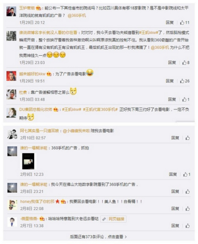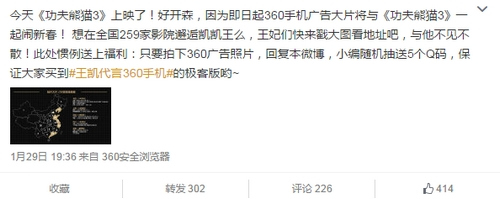 不僅僅是院線投放,360手機(jī)通過貼片廣告與粉絲展開更多互動(dòng),拍下貼片廣告@微博360手機(jī)(圖3),即有機(jī)會(huì)獲得限量版的手機(jī)Q碼,打通線上下,形成營銷閉環(huán),不但能更精準(zhǔn)地鎖定消費(fèi)人群,而且還可最大化地助推消費(fèi)者購買,伴隨著春節(jié)票房一路飆升,360手機(jī)在院線也將獲得更多關(guān)注。