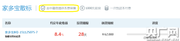 在鏈家理財?shù)木W(wǎng)站上,中融信給出的承諾是“中融信擔(dān)保公司會提供擔(dān)保,借款人一旦發(fā)生逾期還款,即啟動1億保證金進行本息代償”。