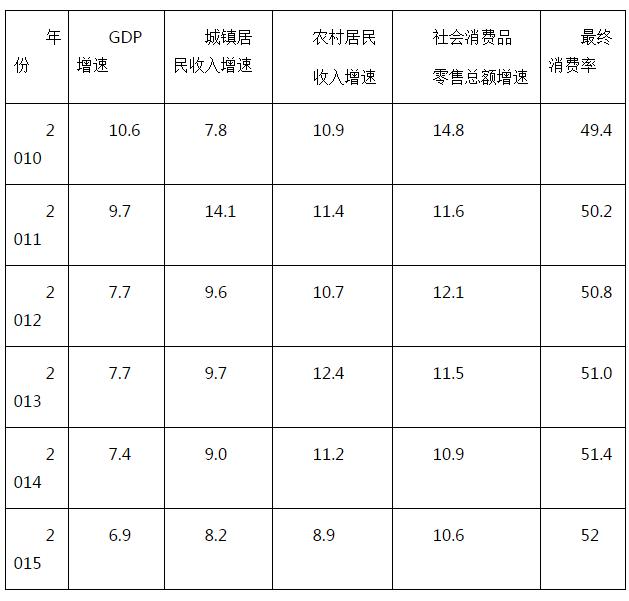 眾所周知,無(wú)論從短中長(zhǎng)期看,一個(gè)國(guó)家居民收入是消費(fèi)支出水平的基礎(chǔ),收入增長(zhǎng)越快,消費(fèi)增長(zhǎng)越快。表1顯示:自2011年來(lái),我國(guó)城鄉(xiāng)居民收入開(kāi)始跑贏GDP增長(zhǎng)速度,如2010年,GDP增速是10.6%,高于城鎮(zhèn)居民收入7.8%增速,低于農(nóng)村居民10.9%增速,2011—2015年,城鄉(xiāng)居民收入已經(jīng)連續(xù)5年超過(guò)GDP增速,且呈現(xiàn)出農(nóng)村居民收入增速快于城鎮(zhèn)居民收入增長(zhǎng)速度?紤]勞動(dòng)力素質(zhì)提高、人力資源配置更加靈活、全面小康共享型社會(huì)等更高發(fā)展階段新制度的構(gòu)建并完善,我國(guó)城鄉(xiāng)居民的收入可以繼續(xù)維持較高增長(zhǎng)速度。