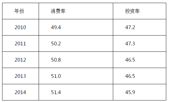 從表2看出:自2011年以來(lái),按照支出法計(jì)算我國(guó)GDP構(gòu)成中,消費(fèi)率從多年持續(xù)下降進(jìn)入上行通道,突破50%,2012—2014年分別是50.2%、50.8%、51.0%、51.4%,2015年預(yù)計(jì)能夠突破52%。同期投資率則逐年下降,從2010年47.2%降至2014年45.9%,預(yù)計(jì)2015年可能降至45%以內(nèi)。