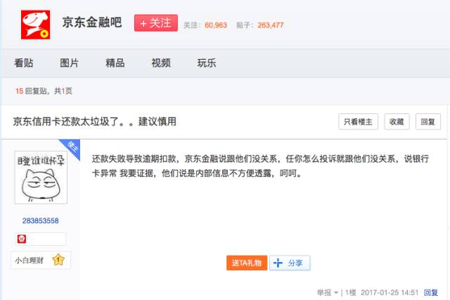 近期,有網(wǎng)友在百度貼吧爆料稱,此前用京東金融信用卡還款,出現(xiàn)還款失敗情況,并導(dǎo)致逾期扣款!熬〇|金融說跟他們沒有關(guān)系,任你怎么投訴就跟他們沒有關(guān)系,說是銀行卡異常!